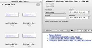 I primarily use Safari for web browsing, mostly because it’s smoother and faster than Firefox, and the Web Inspector is just as useful as Firebug. As time passes, I end up with a lot of web pages open, and I like to clear out my browser tabs on a regular basis. Safari doesn’t really have a long-term session-saving option, so I save lists of open tabs to various applications. I used to use SafariStand to do this, but it got too buggy and slow for me. I use VoodooPad for it, but I like the sorting and searching option in Evernote, both on my desktop, and synced online and to my iPhone.