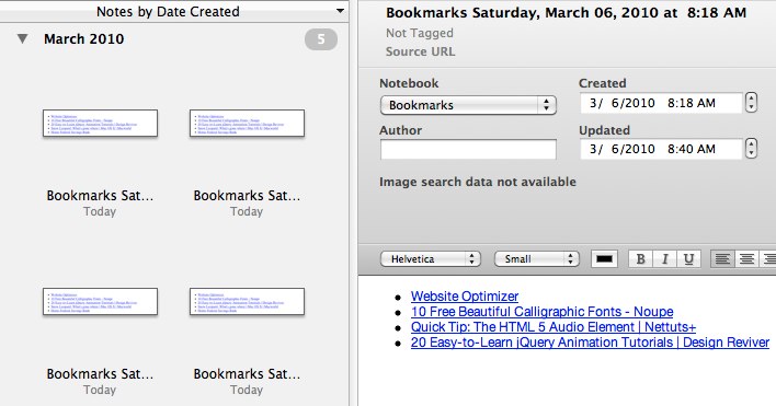 That’s it. Now there’s a note in Evernote, in a notebook called “Bookmarks,” titled something like “Bookmarks Saturday, March 06, 2010 at 9:04 AM.” Here’s the code in its entirety: