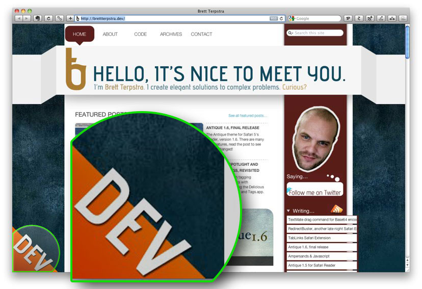 That sticks a dogear image I made into the lower left corner of the site, in a fixed position that is always visible but rarely in the way (you’re welcome to steal the image, if you want it). It’s an easy trick, but I’ve found it saves me a lot of frustration when I get too obsessed with a minor detail to bother looking at the URL and realizing I’m not even refreshing the right version of the site. Maybe you never have that problem, in which case I applaud your level, collected personality. People like me, though, can always use a little extra help.