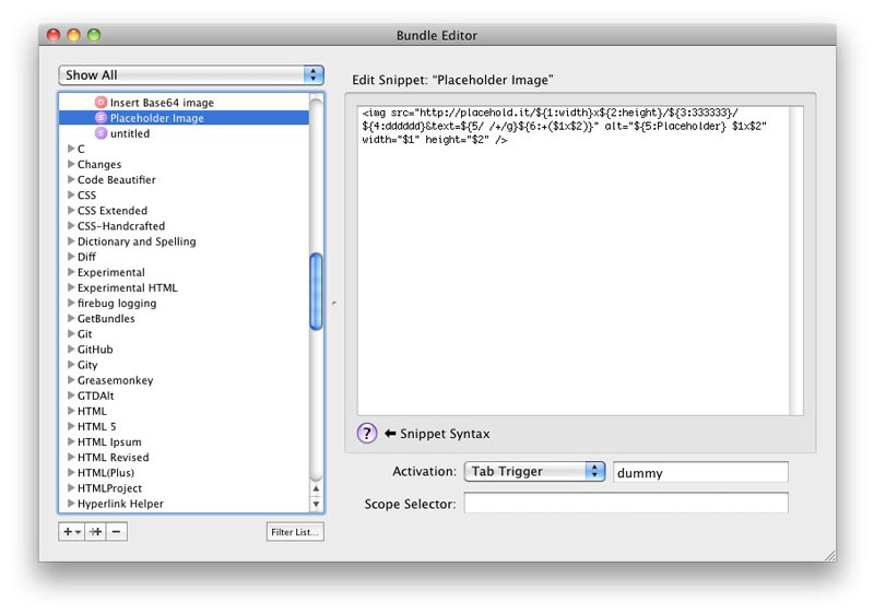 Select that bundle in the left column and use the plus sign button at the bottom again, this time choosing New Snippet. Name the new Snippet “Placeholder Image” and set the Activation to Tab Trigger and enter your preferred shortcut in the field next to it. I’m using “dummy,” which is the same as my TextExpander snippet, but I have TextExpander disabled in TextMate, so it overlaps nicely.