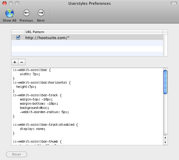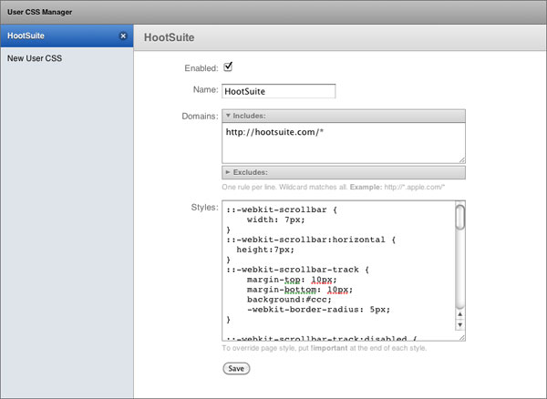 Click the “A” icon in the menubar after the extension is enabled, and start a new style definition called “HootSuite.” Enable it, set the domains to “http://hootsuite.com/*” and paste the code below into the textarea. Save it, and reload HootSuite. Skip to the end for the code.