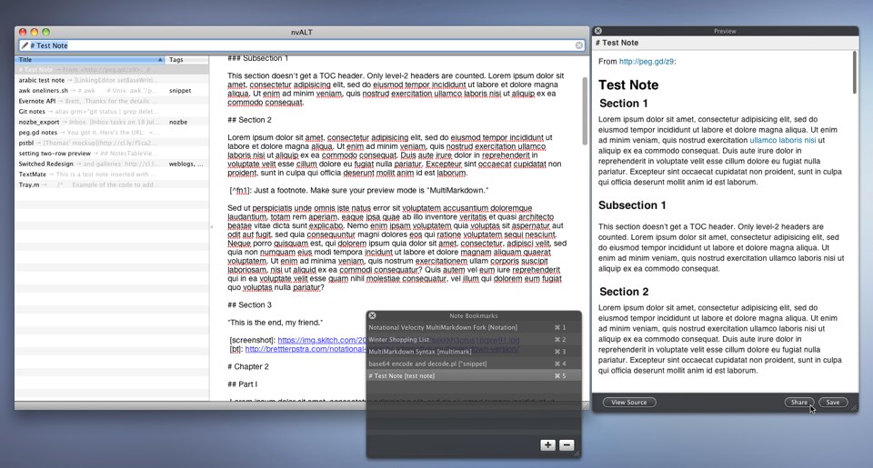 The first “social” option I’m adding to nvALT. http://peg.gd is a project of Robert Palmer’s which allows me to offer the ability to share notes with friends, with full rendering of Textile, Markdown or MultiMarkdown. When you click the share button, the title and contents of the note are sent to peg.gd, and a popup returns the resulting short URL. The URL is automatically copied to the clipboard, and the button on the popup allows you to open it in your default browser immediately.