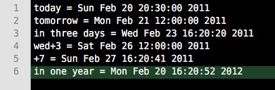 It would also be pretty easy to port to any other system, including an OS X system service. You’d just need to make sure you include the Chronic library, either bundled or install the gem, and find a way to get the text input without using TextMate’s dialog. CocoaDialog or a service that acts on selected text would fit the bill.