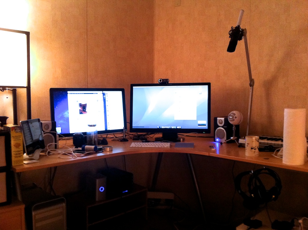First, a “command central” for writing music, coding and fiddling. This has my Mac Pro with a dual-monitor setup, studio monitors, my Oxygen 49 and several mics, my acoustic, electric and bass guitars on a rack to the left and a lot of drawers for cables and additional gizmos (the Mac Pro there also runs the home automation and media servers). I can and will do my day job here, but this is the one I’m allowed to be chaotic at. It’s not that I’m not creative in a sterile (read minimal) environment, but the byproduct of my most creative moments is, well, chaotic surroundings. I’ve decided to just let that happen as it always has, but designate “concentration” spaces for my other two modes.