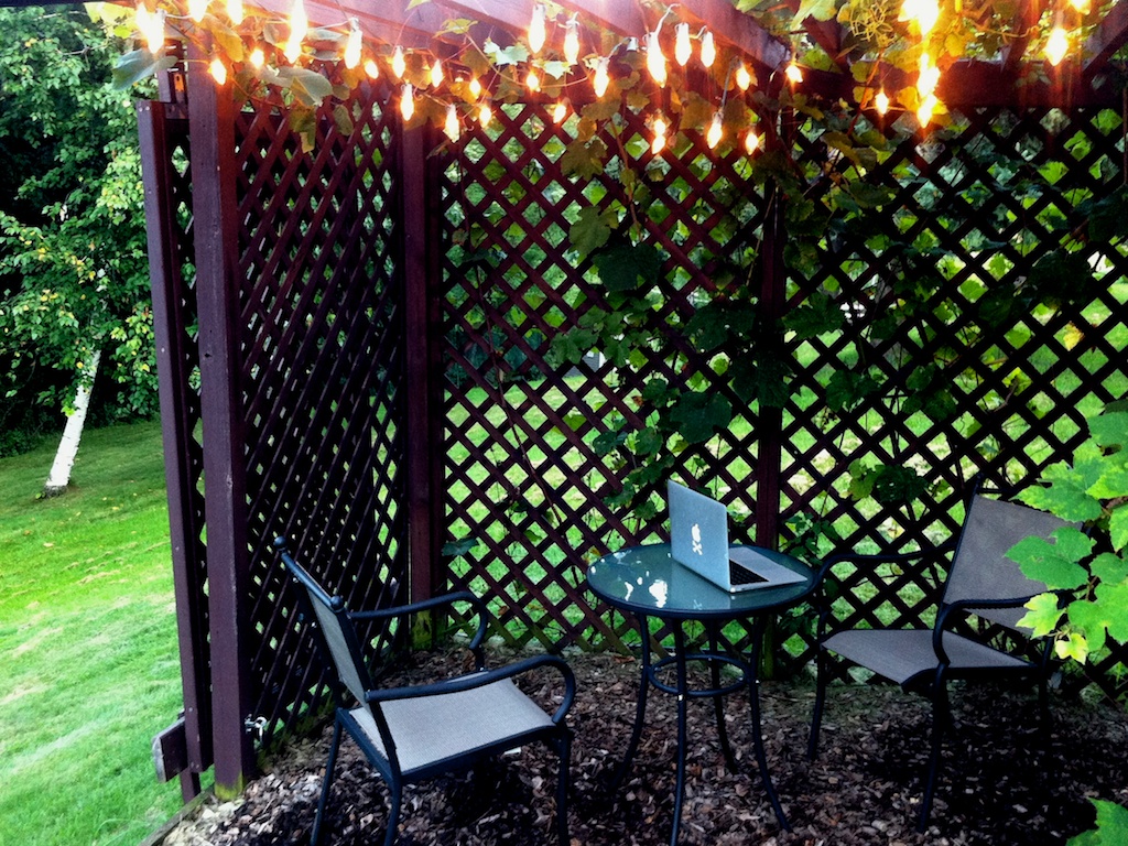 Lastly, the work-only space. On nice days in the warm 1/3 of the Minnesota year, I have an amazing outdoor office. It’s a small table in a small walled garden facing the heavily wooded area on the slope of the bluff. There are warm, yellow rope lights across the top of the area and the gate slides open to the back yard and woods. It’s pretty close to my definition of perfect. In the cold months, I have an extra space near my main office that I’ll be converting, but I won’t have to worry about that for another month.