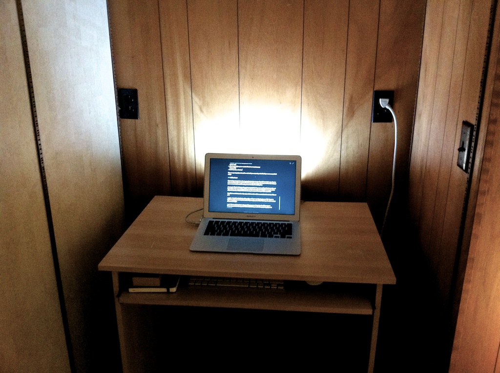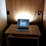 On the other side of my office is a nook with a small desk which has a keyboard drawer with a Bluetooth keyboard, Magic Mouse and a large Moleskine. There’s also a small lightbox. My MacBook Air sits in front of the lightbox, which is angled toward the wall, and I get a nice, empty desk with a comforting glow around my work area. This desk is for writing and nothing else. My brain is easily trained to accept certain reactions to certain spaces (e.g. bed for sleeping), so I think this will work well.