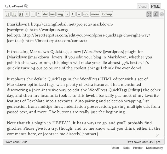 If you write in Markdown and use WordPress, you’d be insane not to try this out. Version 0.8 just became available in the WordPress Plugin Repository.