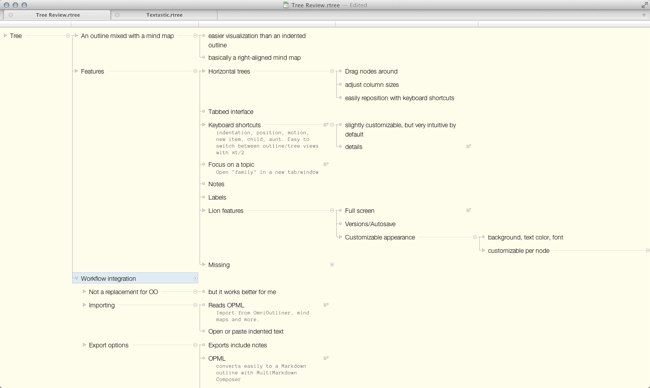 Addendum: I was just notified about a great post by Brandon Pittman, with a more detailed comparison between OmniOutliner and Tree. Check it out.
