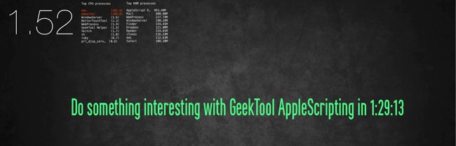 What I’m hoping is that this example will get a ball rolling, and someone will see a little bit more exciting potential in it than I came up with on a lazy Sunday. Got a cool AppleScript (or even an idea) for GeekTool? I’d love to hear about it!
