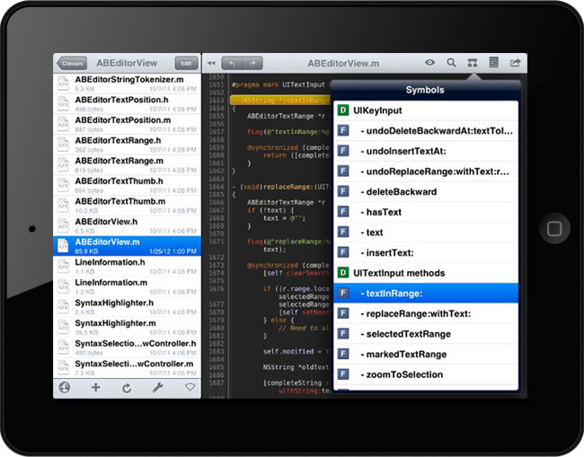 The primary focus is on coding, as is evident in the core feature set: code completion, TextMate snippet capabilities, syntax highlighting and auto-indentation make it a pleasure to use, even for quick edits. You can show invisibles and use soft tabs (spaces) when you want to. There’s a symbol navigator that recognizes, I think, every language (over 80) that Textastic supports. You also have complete control over document properties, including line endings, encoding and language definition.