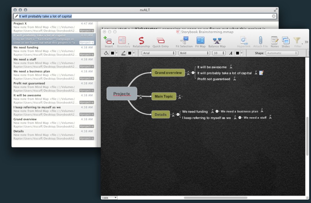 Yes, MindManager has built-in support for notes, and on occasions when you’re sharing them with others it’s preferable to use the internal ones. When I’m brainstorming, though, having my notes available outside of a single application and universally accessible is more useful. Look at me feeling obligated to explain myself.