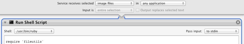 Because the script requires some customization (as simple as it may be), I’m not distributing it as a pre-rolled Service. You’ll need to load up Automator, create a new Service project and add the “Run shell script” action to it by dragging it in from the library on the left. Paste the script into that action and set the interpreter to Ruby. Set the input to Image files. It should look like: