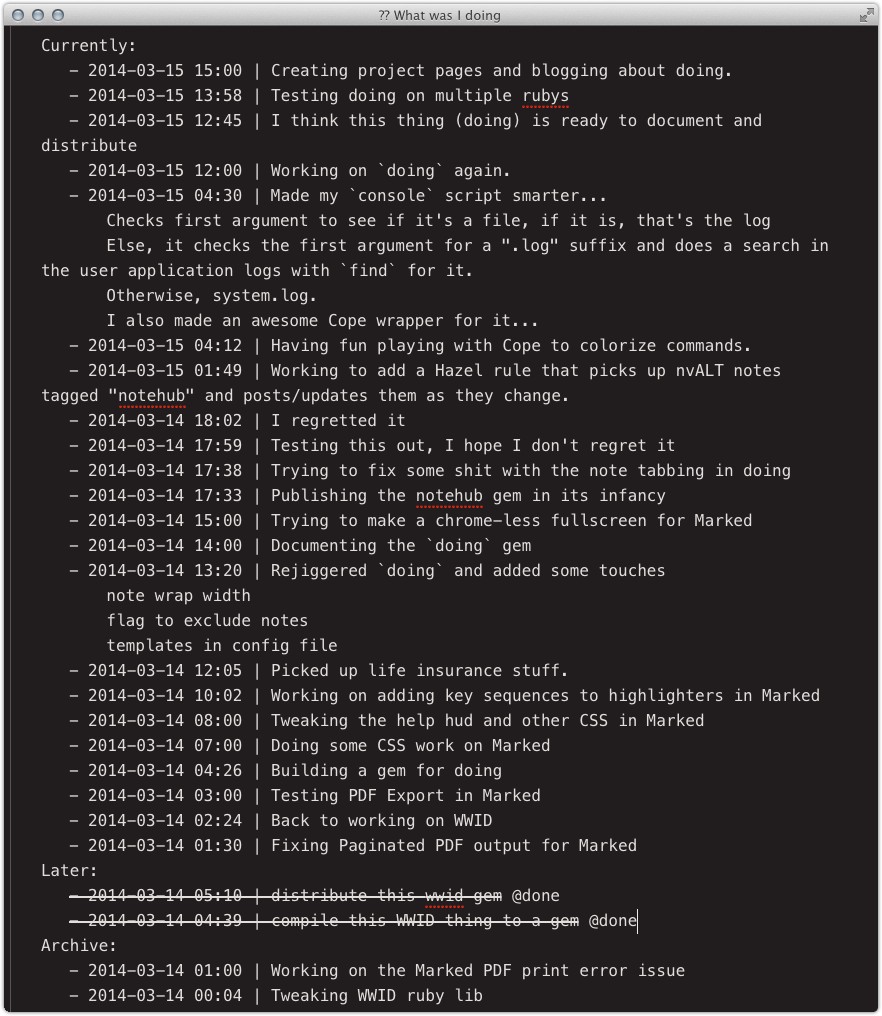 The new doing utility adds more robust reporting and display tools (with templating and external configuration). You can add entries to both the “current actions” section and the “later” section with doing now and doing later commands. You can even archive old entries from the command line and clean up clutter.