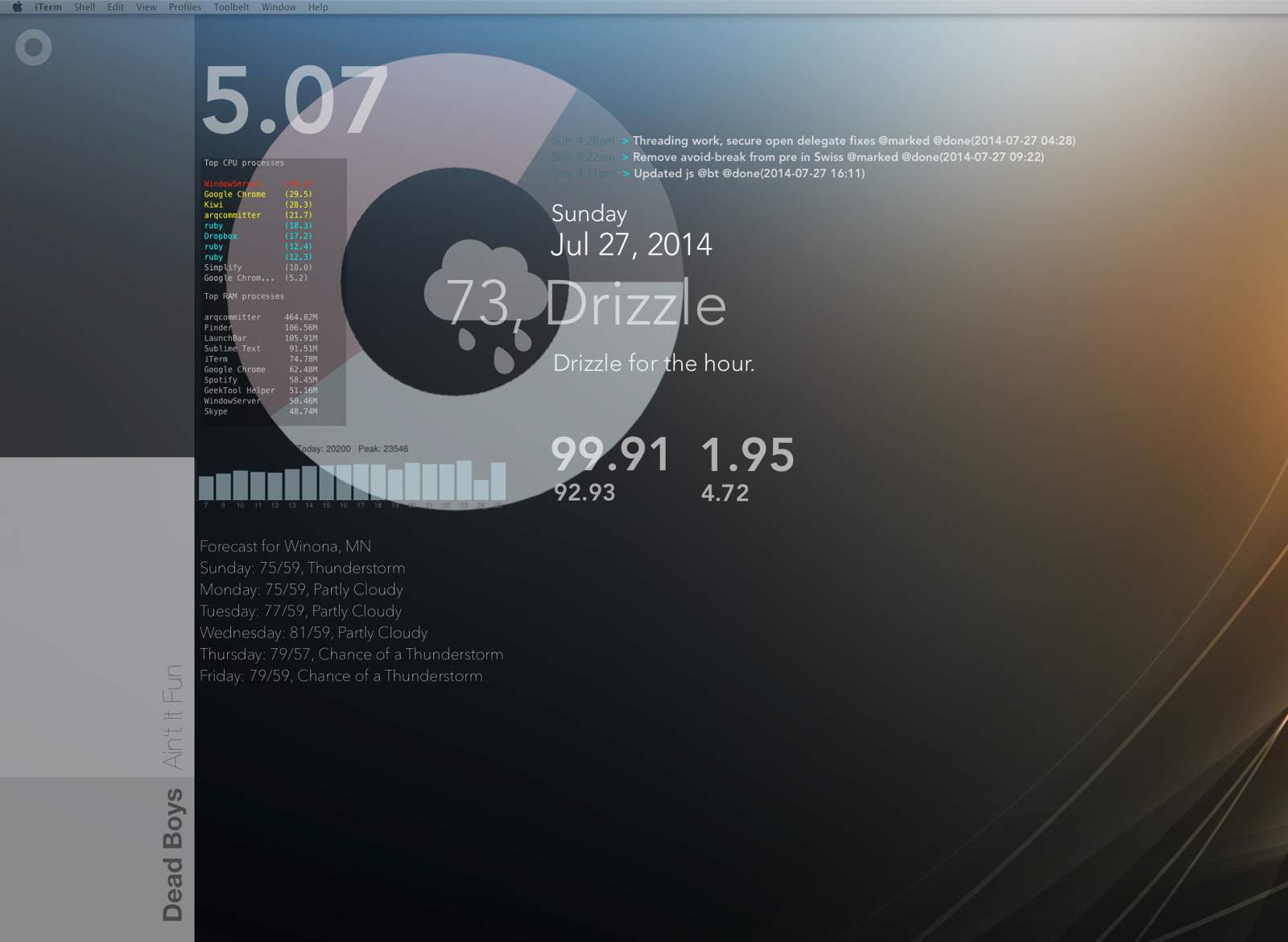 Given that I spent too much of my Sunday fooling around with my GeekTool setup and did very little of any use, I figured I’d at least show off the results.