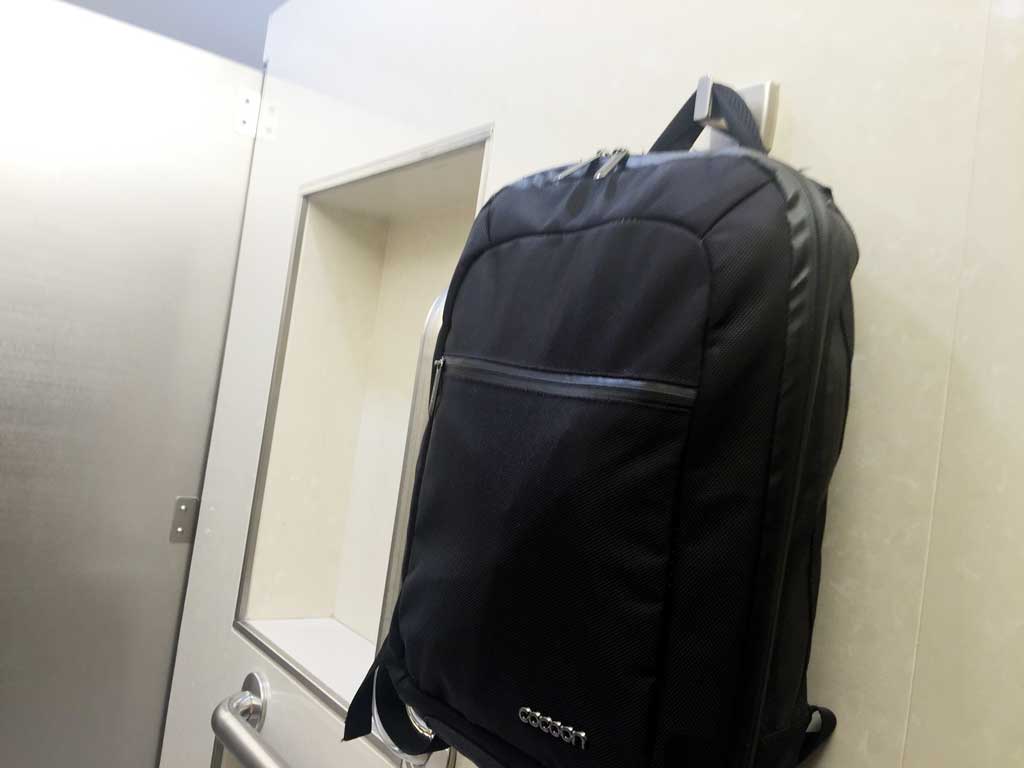 Next, the hooks for hanging bags are by the stool, not on the back of the door. If you’re going to sit for a bit, and your entire life is currently contained in a backpack, your only choice for accessing it is usually to put your bag on the floor in front of you. In this case, it’s a roomy stall (back to front), and that would leave you in the usual position of choosing between “bag on the bathroom floor” and “semi-safely suspended.” The hooks in this restroom are positioned not only closer to the stool, but at a height that actually makes sense for a seated adult human.