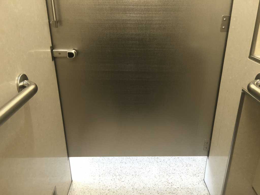 First, there are no gaps on the sides of the door, and the walls of every stall go to the floor. There are air-passage breaks in the base of the wall, but if you drop change out of your pocket, there’s a 96% chance it won’t roll into the next stall.2 In terms of a public restroom, it’s complete privacy. I was never a big fan of locker rooms in school, and I’ve always hated that there was a certain air of that in public restrooms.