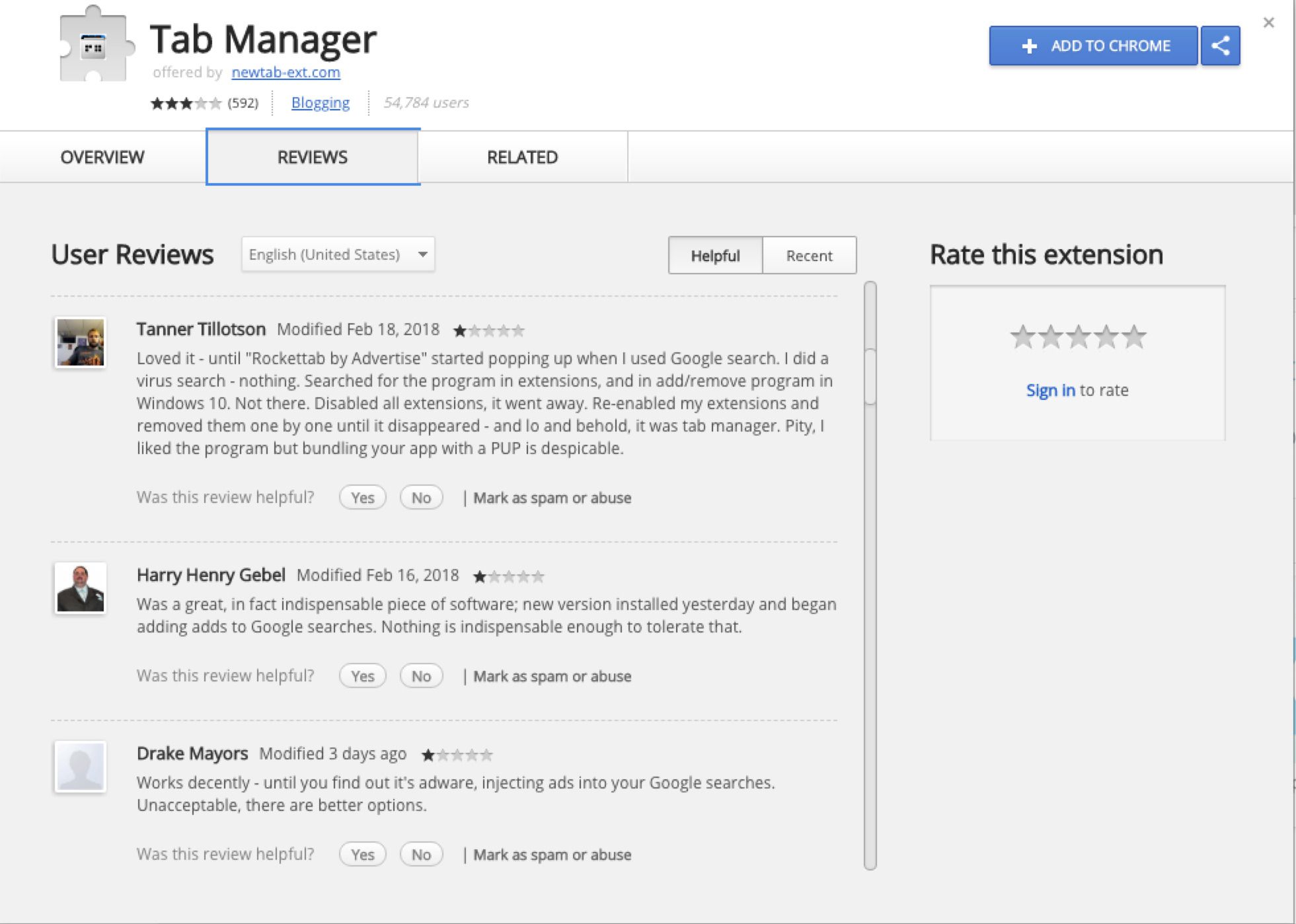 I’m not going to link it here, but see the image above if you need to confirm which one I’m talking about. You’ll immediately note on the Reviews tab that it’s reported as malware. Repeatedly. Many, many times. I reported abuse, as I assume many of the dozens of commenters have, so it’s unfathomable to me that the Chrome Web Store has continued to allow its presence. This apparently only happened with the latest update to the extension published this month (February, 2018).