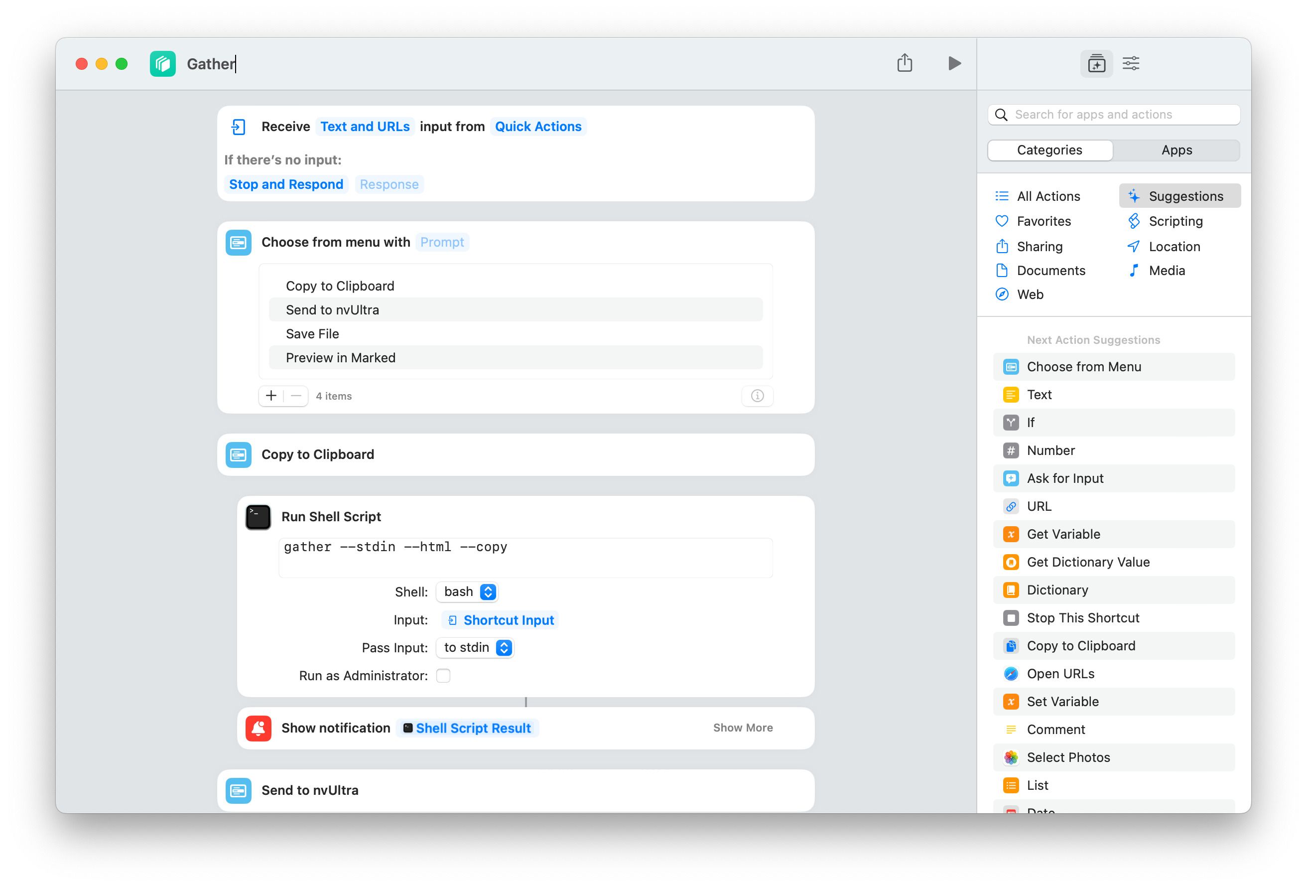 I’m including a couple of example Shortcuts below, and the Gather one shows a menu with “Copy to clipboard,” “Add to nvUltra,” “Save to file,” and “Preview in Marked.” All of the gather commands needed for these actions are demonstrated.