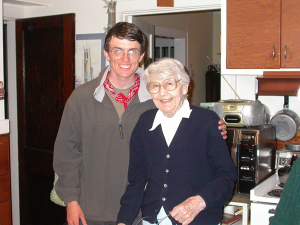 Entry from Wesley It's the two month anniversary of me leaving Savannah. Wow, that's a thought. So, to celebrate, I walked like a frickin maniac...make that a maniac that walks a whole lot. I think I walked over 25 miles today. It hurts. I love it. I got to Arnold and it was only 1 something so I decided I was gonna just cruise and get to Kirkwood today. I didn't stop for anything. I had one meal. It feels great walking beyond anything in me that tells me to stop. Anyone who runs distance knows what I'm talking about. I had to try all the tricks to keep going. Singing really loud, talking to things on the road, all that. I was just coming in to Kirkwood when my Uncle Dan and Aunt Margy drove up. It was past 7 and was getting to be very dusk (a rain storm had just passed). They figured they should find me before it got dark. There were only 93 bottles of root beer left on the wall. We went to Grandma's house